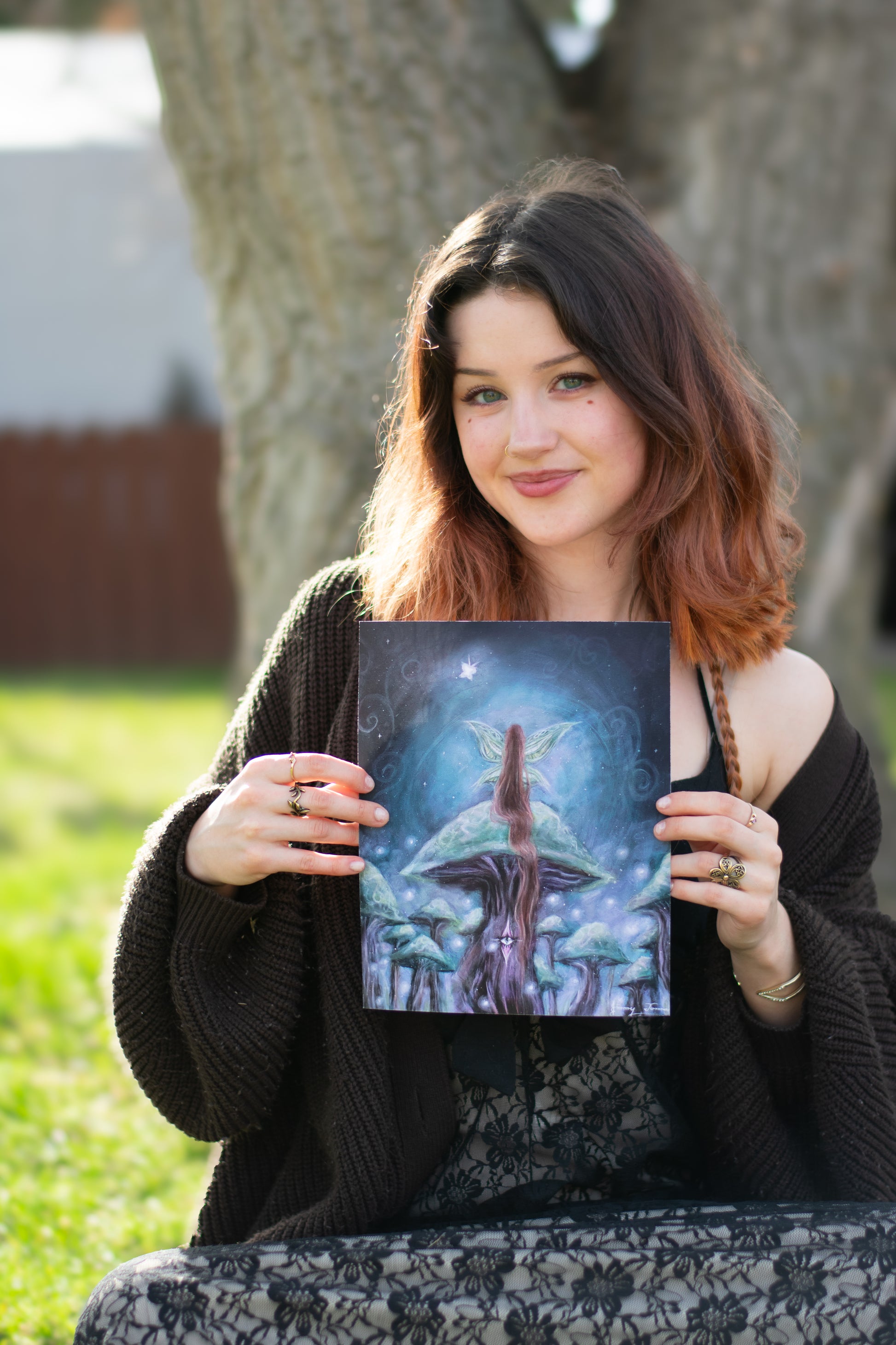 Toadstool Guardian is an acrylic on canvas piece showcasing feelings of solitude, peace and quiet- something we all need more of. This anonymous fairy sitting on top of her own mushroom home looks over her village in the Eastern Fairylands and protects it from outside noise and overlapping grievances- this is her space, her sacred location where she can just be. Hopefully this piece brings a little more peace into your sacred space, representing how you own that space and look over it, nurture it and let it nurture you.